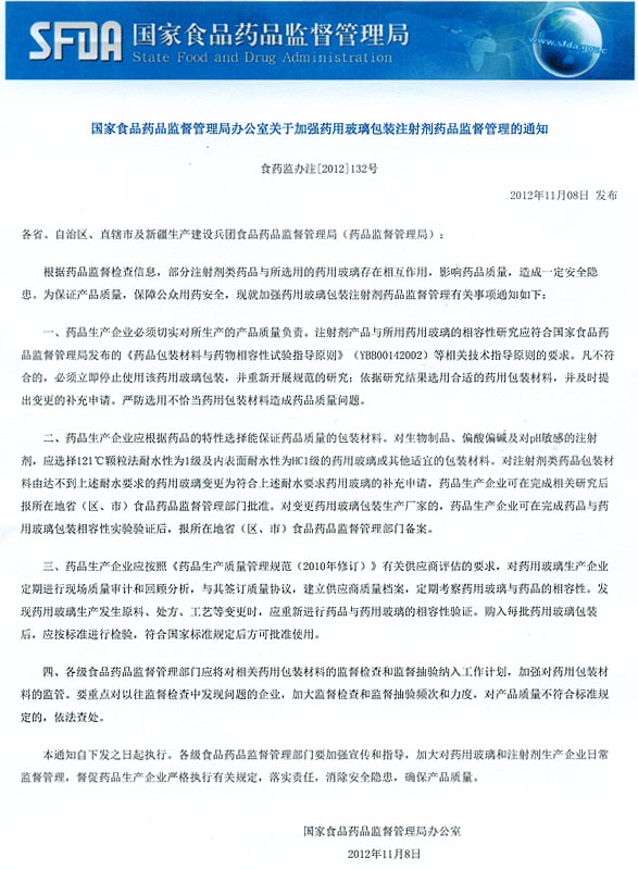 國家食品藥品監(jiān)督管理局辦公室關(guān)于加強藥用玻璃包裝注射劑藥品監(jiān)督管理的通知